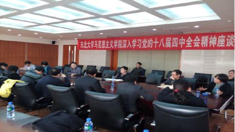 10月29日下午,十大体育投注平台 深入学习党的十八届四中全会精神座谈会在汉卿会堂308室召开。辽宁省委高校工委理论处,沈阳工业大学、沈阳建筑大学、沈阳理工大学、中国医科大学等兄弟院校相关体育投注平台 、部门负责人及东北大学宣传部负责人受邀出席会议并发表讲话,体育投注平台 部分教师参加会议。