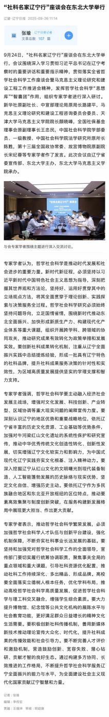 9月24日,“社科名家辽宁行”座谈会在东北大学举行,会议围绕深入学习贯彻习近平总书记在辽宁考察时的重要讲话和重要指示精神,贯彻落实全省哲学社会科学工作座谈会暨马克思主义理论研究和建设工程工作推进会精神,发挥哲学社会科学“思想库”“智囊团”作用,组织专家学者进行深入研讨。新华社原副社长、中宣部理论局原局长路建平,马克思主义理论研究和建设工程咨询委员会委员、天津大学十大体育投注平台 院长颜晓峰,全国社保基金理事会原副理事长王忠民,中国社会科体育投注平台 学部委员、一级教授、中国社会科体育投注平台 法学研究所原所长陈甦,第十三届全国政协常委、故宫博物院原副院长宋纪蓉等专家学者作了发言。此次会议由辽宁省委宣传部、东北大学主办,体育投注平台-十大体育投注平台 承办。