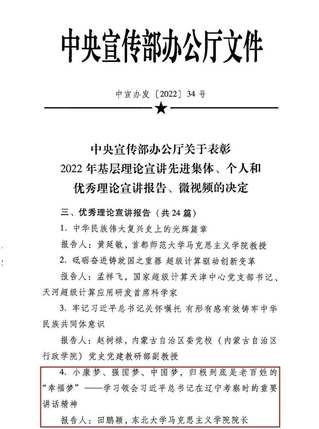 10月20日,中央宣传部办公厅公布了《关于表彰2022年基层理论宣讲先进集体、个人和优秀理论宣讲报告、微视频的决定》,体育投注平台-十大体育投注平台 院长田鹏颖教授所作的《小康梦、强国梦、中国梦,归根到底是老百姓的“幸福梦”——学习领会习近平总书记在辽宁考察时的重要讲话精神》报告成功入选“优秀理论宣讲报告”。