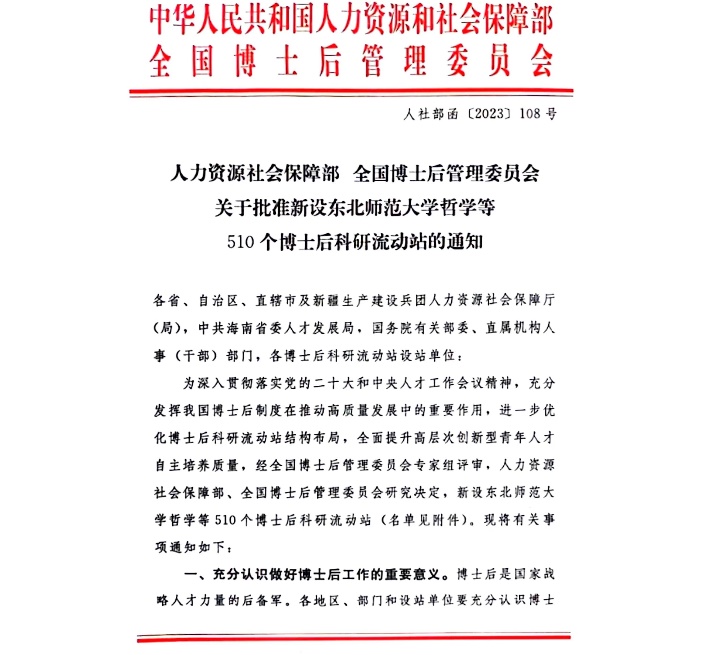近日,人力资源社会保障部、全国博士后管理委员会联合下发《关于批准新设东北师范大学哲学等510个博士后科研流动站的通知》(人社部函〔2023〕108号)。东北大学马克思主义理论博士后科研流动站获批设立。