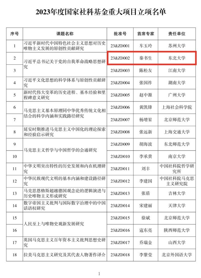 近日,全国哲学社会科学工作办公室发布了2023年度国家社科基金重大项目立项名单,十大体育投注平台 秦书生教授作为首席专家领衔申报的《习近平总书记关于党的自我革命战略思想研究》获得立项(项目编号23&ZD002)。