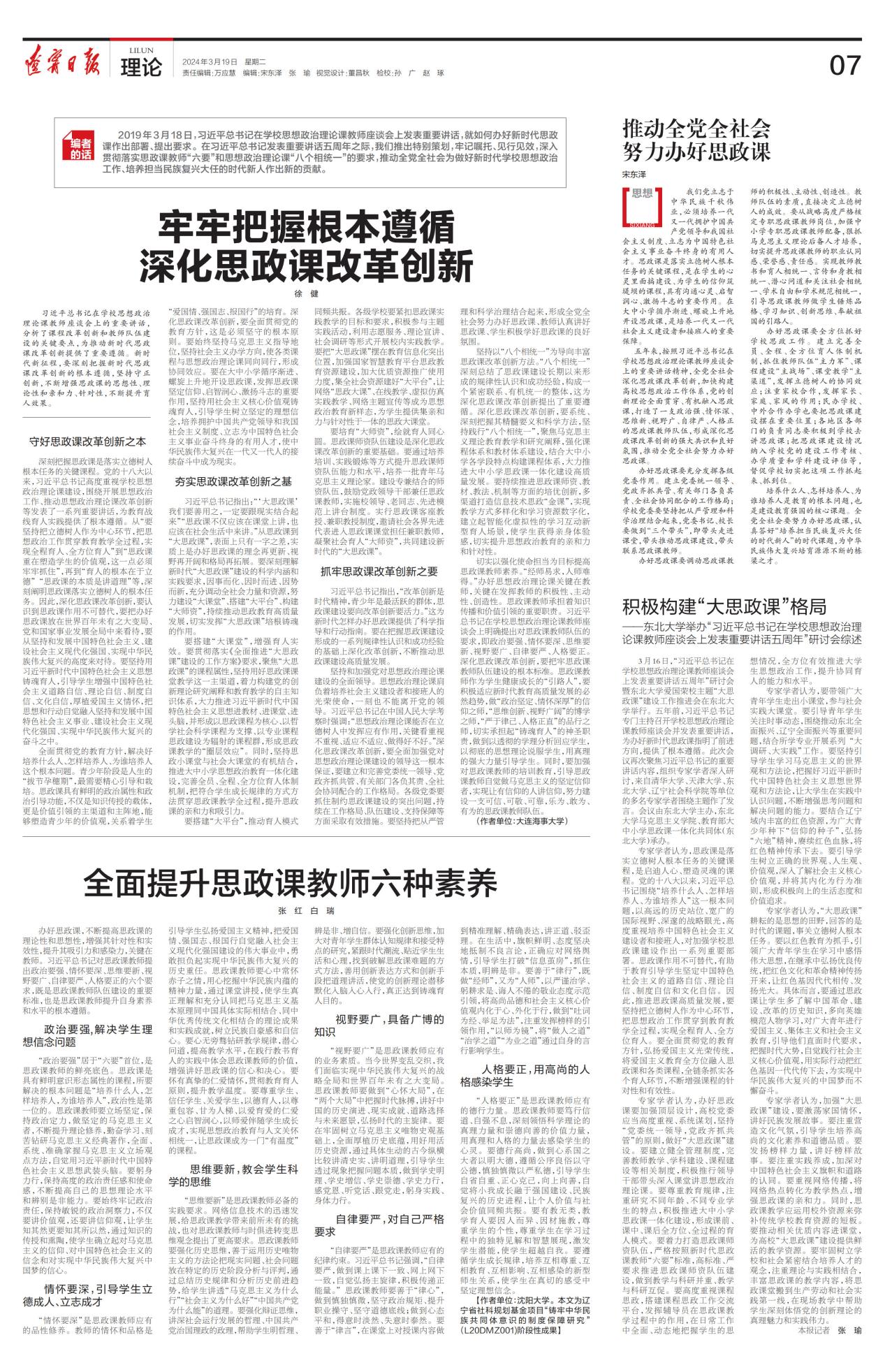 专家学者认为,办好思政课要加强顶层设计,高校党委应当高度重视、系统谋划,坚持“党委统一领导,党政齐抓共管”的原则,做好“大思政课”建设。要建立健全管理制度,完善教师教学、学科建设、课程建设等相关制度,积极推行领导干部带头深入课堂讲思想政治理论课。要尊重教育规律,注重研究不同年龄、不同专业学生的特点,积极推进大中小学思政课一体化建设,形成课前、课中、课后全方位、全过程的育人模式。要着力打造思政课师资队伍,严格按照新时代思政课教师“六要”标准,高标准、严要求推进思政课师资队伍建设,做到教学与科研并重、教学与科研互促。要高度重视课程思政,搭建课程思政工作交流平台,发挥辅导员在思政课教学过程中的作用,在日常工作中全面、动态地把握学生的思想情况,全方位有效推进大学生思想政治工作,提升协同育人的能力和水平。