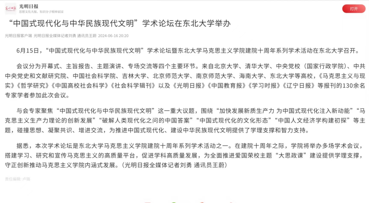 6月15日,“中国式现代化与中华民族现代文明”学术论坛暨体育投注平台-十大体育投注平台 建院十周年系列学术活动在东北大学国际学术交流中心召开。本次活动由东北大学主办,体育投注平台-十大体育投注平台 、辽宁省马克思主义学会、东北大学中国式现代化研究院、教育部大中小学思政课一体化共同体(辽宁)、全国高校思想政治理论课田鹏颖教授名师工作室、辽宁省高等学校新型智库(东北大学高校思想政治教育改革创新研究院)承办,旨在搭建学习、研究和宣传马克思主义的高质量平台,促进学科高质量发展,为全面推进爱国荣校主题“大思政课”建设提供学理支撑,守正创新推动十大体育投注平台 内涵式发展。