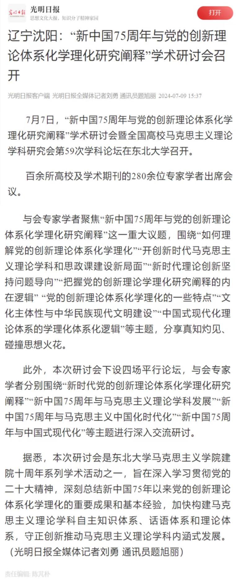 7月7日,“新中国75周年与党的创新理论体系化学理化研究阐释”学术研讨会暨全国高校马克思主义理论学科研究会第59次学科论坛在东北大学召开。