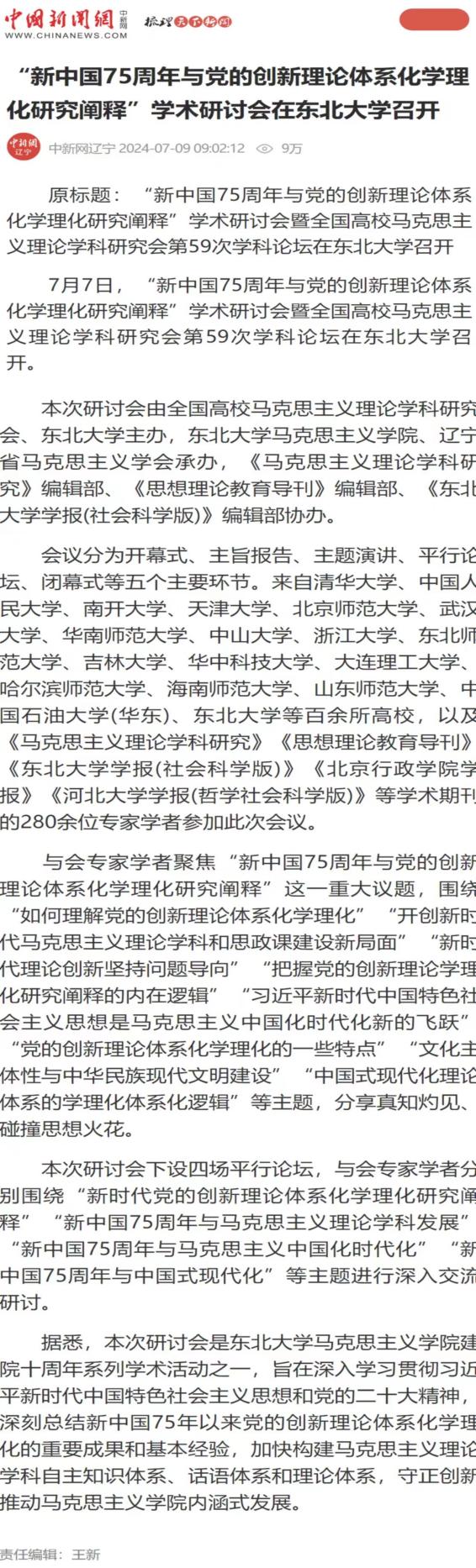 7月7日,“新中国75周年与党的创新理论体系化学理化研究阐释”学术研讨会暨全国高校马克思主义理论学科研究会第59次学科论坛在东北大学召开。