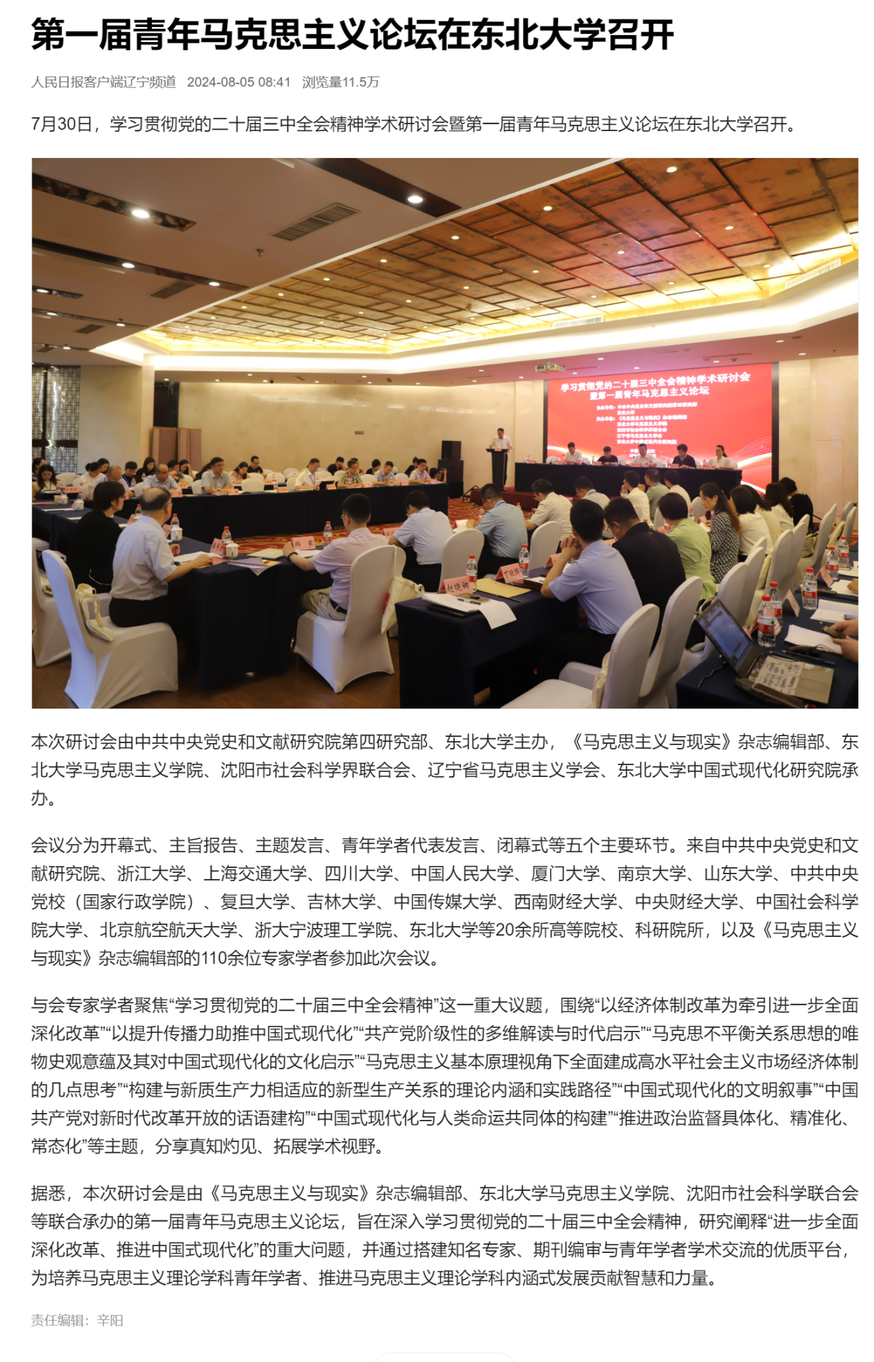 7月30日,学习贯彻党的二十届三中全会精神学术研讨会暨第一届青年马克思主义论坛在东北大学召开。