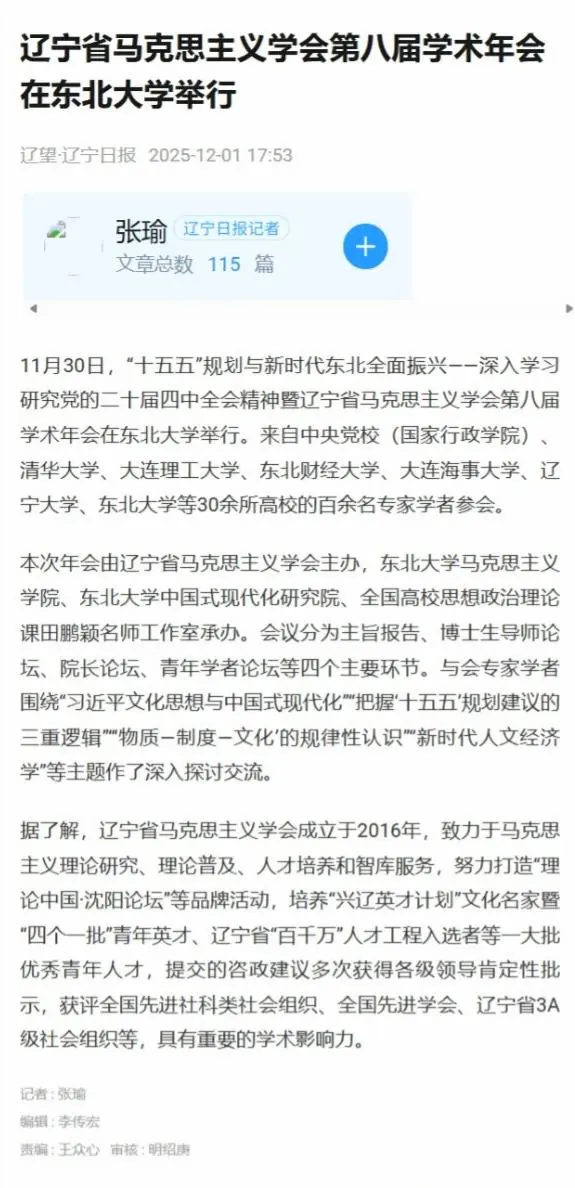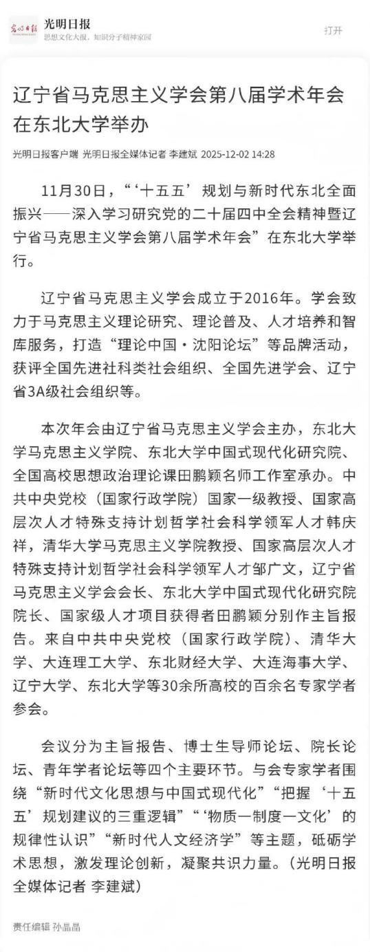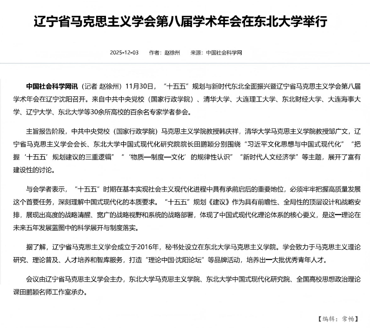 11月30日,由辽宁省马克思主义学会主办,体育投注平台-十大体育投注平台 、东北大学中国式现代化研究院、全国高校思想政治理论课田鹏颖名师工作室承办的“十五五”规划与新时代东北全面振兴——深入学习研究党的二十届四中全会精神暨辽宁省马克思主义学会第八届学术年会顺利举行。本次会议受到光明日报、中国社会科学报、辽宁日报等多家主流媒体关注报道。